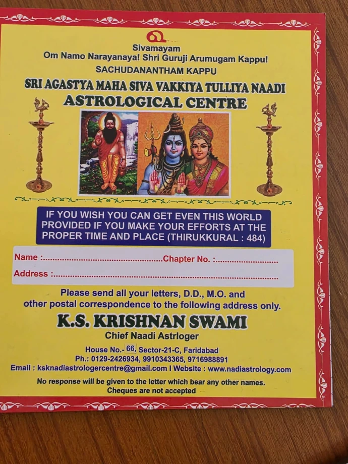 Swami K.S. Krishnan Nadi Astrology is one of the most respected and authentic Nadi Astrology centers in India, with a legacy of over 80 years of service across three generations. At our center, an individual’s thumb impression is used to identify the corresponding palm-leaf manuscripts preserved in our library. These ancient palm leaves are carefully classified and indexed to enable the search for the native’s unique life record. The process requires patience and cooperation, as the reader verifies specific life details from each leaf until the exact manuscript is identified. Not every individual has a corresponding leaf, as these sacred predictions are believed to be meant for selected souls only